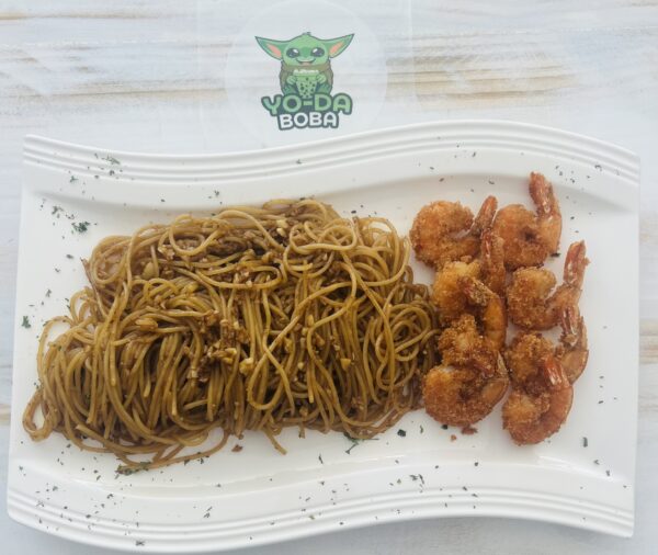 Garlic Noodle with fried shrimp / Pasta al ajillo con camarones fritos
